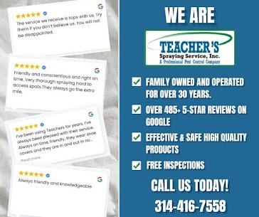 Teacher’s Spraying Service is a trusted, family-owned pest control company based in St. Louis, MO. With over 30 years of experience, the company is committed to protecting homes and businesses from rodents, termites, bed bugs, and other regional pests. Known for its client-first approach, professional technicians, and eco-friendly practices, Teacher’s Spraying Service delivers effective, tailored solutions that safeguard health, property, and peace of mind.